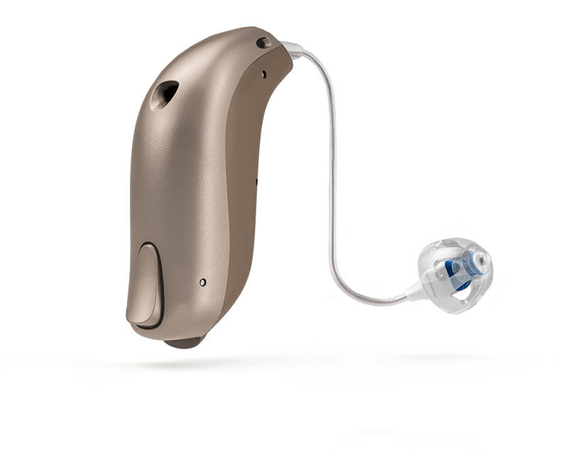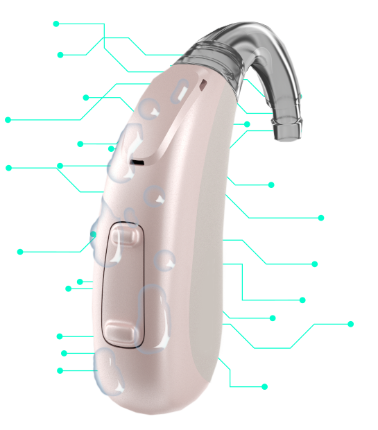 Parte do dispositivo se acomoda atrás da orelha, conectada ao canal auditivo por um fio fino e discreto com encaixes de silicone ou moldes personalizados. Adaptação rápida, design versátil e discreto.